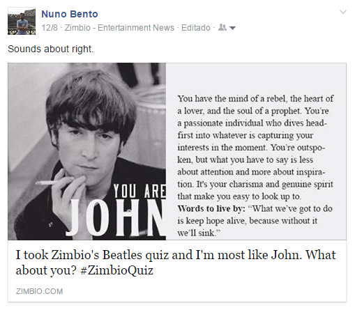 Hoje o John Lennon faria 75 anos. O meu John. Sim, meu. Não que eu tenha especial orgulho nisso, porque toda a vida eu quis ser Paul. Mas não é Paul quem quer, é Paul quem pode. E eu não sou Paul, sou John. Temperamental, apaixonado, obstinado, conduzindo o dia-a-dia com o sangue a ferver nas veias. Não é fácil ser assim, acreditem. E também não deve ser fácil para quem me rodeia. Preferia a constância, o método e a segurança do Paul. Ou pelo menos acho que preferia. Mas talvez assim perdesse a piada.